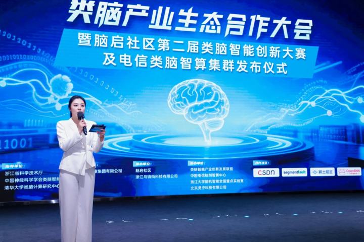 近日,“类脑产业生态合作大会暨脑启社区第二届类脑智能创新大赛及电信类脑智算集群发布仪式” 在杭州圆满落幕。本次大会由浙江省科学技术厅、中国神经科学学会类脑智能分会、清华大学类脑计算研究中心指导,中电海康集团有限公司主办,脑启社区、浙江乌镇街科技有限公司承办,类脑智能产业创新发展联盟、浙江大学脑机智能全国重点实验室、北京灵汐科技有限公司、中国电信杭州智算中心协办。