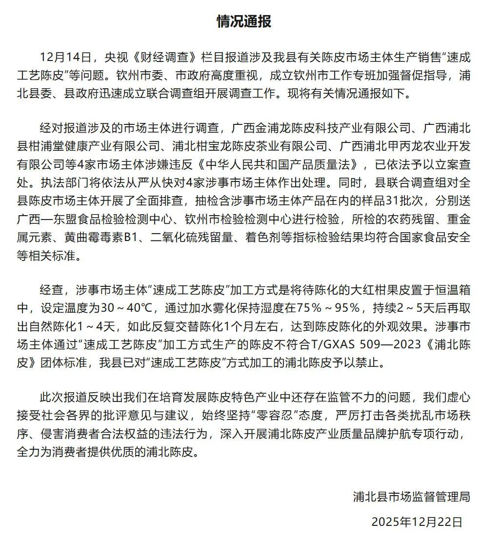 浦北县市场监管局在通报中称,12月14日,央视《财经调查》栏目报道涉及浦北县有关陈皮经营主体生产销售“速成工艺陈皮”等问题。钦州市委、市政府高度重视,成立钦州市工作专班加强督促指导,浦北县委、县政府迅速成立联合调查组开展调查工作。