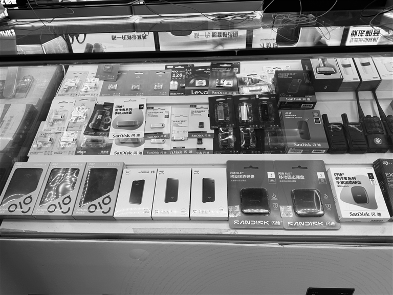 与内存条一起身价飞涨的产品还有移动固态硬盘。记者从杭州百脑汇部分商家处了解到,目前移动固态硬盘的价格与去年年初相比也已经上涨了不少。其中一位店员告诉记者,店内的闪迪1TB移动固态硬盘一年前的定价是300多元,现在价格已经涨到了接近700元。