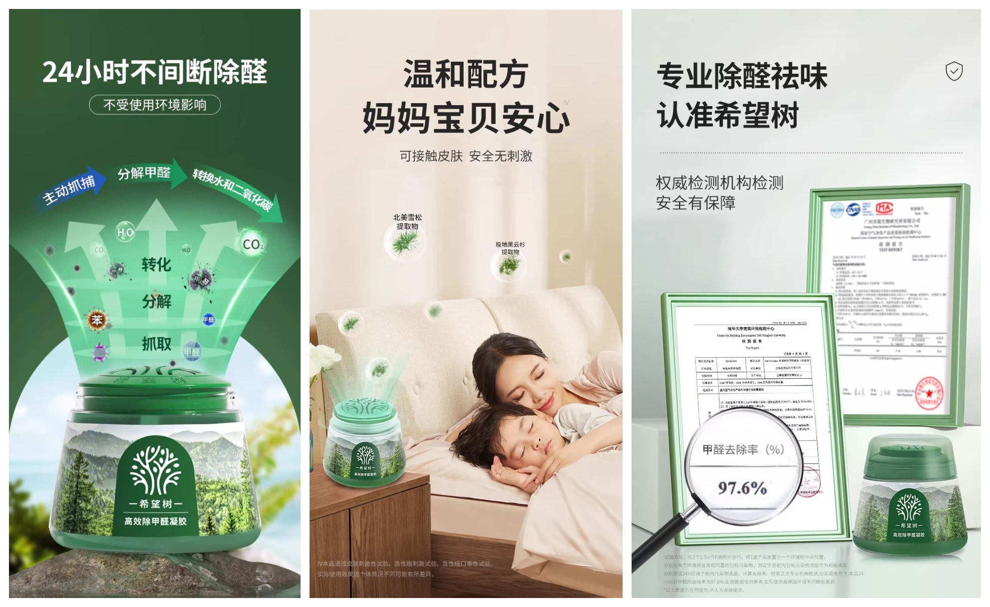 根据王女士提供的线索,记者在多个电商平台网店调查发现,诸多品牌宣称销量领先。记者进一步调查发现,高除醛率是诸多除醛果冻品牌网店的核心宣传点。霍尼韦尔宣称“除醛率99.1%,单罐建议15平方米以内使用”;巴赛夫打出“48小时除醛率高于99%”的旗号,称“一周入驻新家,8罐80平方米以下除甲醛”;希望树称“24小时除醛率97.6%、单罐可处理15平方米左右”,同时强调“24小时不间断除醛,不受使用环境影响”;山山的多个宣传视频均提及“有效除醛率高达99%,不到7天就能搬新家,一罐能分解8到10平方米”,甚至表示“开窗通风只能散味,吹不走附着的甲醛”;绿之源称“一罐轻松搞定20平方米的除醛问题,刚装修完24小时就敢搬新家,真正守护宝宝和老人的健康”。