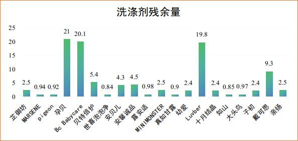 洗涤剂残留量是关乎敏感人群(儿童、孕妇)健康的关键指标,GB/T 24691—2022《果蔬清洗剂》规定其测定值范围为0.84μg/mL—21.0μg/mL。本次测试中,7款样品残留量低于1μg/mL(优秀),1款在1—10μg/mL之间(较好),孕贝、Bc Babycare、Luvber3款样品残留量超过19μg/mL,虽在标准范围内,但表现一般。