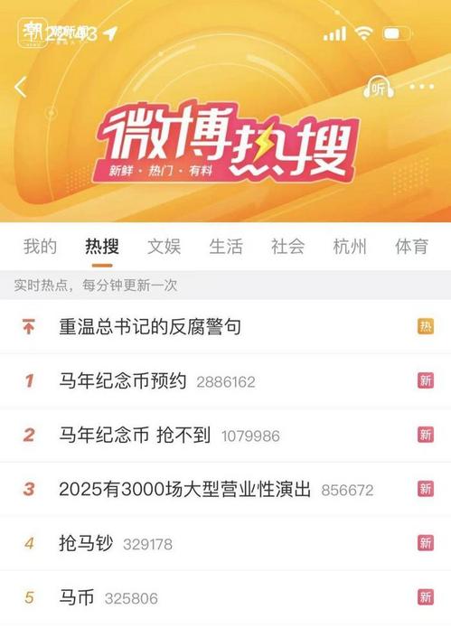 在社交平台上,“马年纪念币预约”冲上热搜第一,“马年纪念币 抢不到”“抢马钞”“马币”也紧随其后,热搜前五名中,相关话题占了四席,热度爆棚。