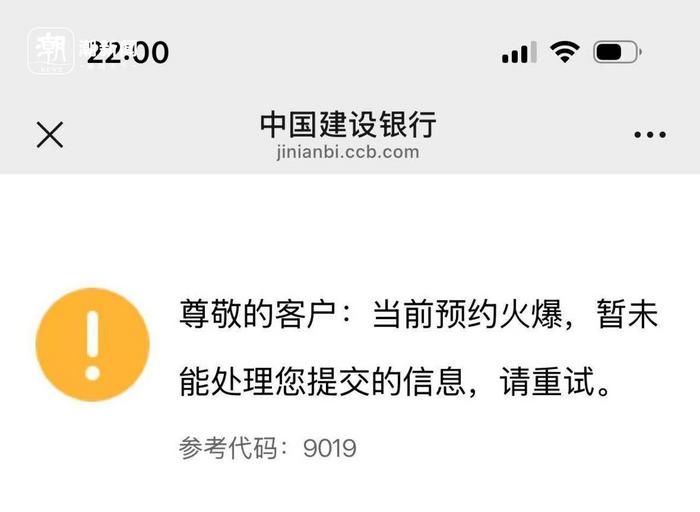 潮新闻记者也早早定好闹钟,提前进入手机端银行预约页面,输入所有预约信息。22:00一到,记者迅速点击“确认”按钮,页面却显示:当前预约火爆,暂未能处理您提交的信息,请重试。