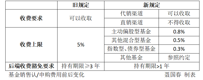 根据《规定》,认/申购费率最高不得超过0.8%,直销渠道0收费。采用后端收费的,持有期大于一年免收费。