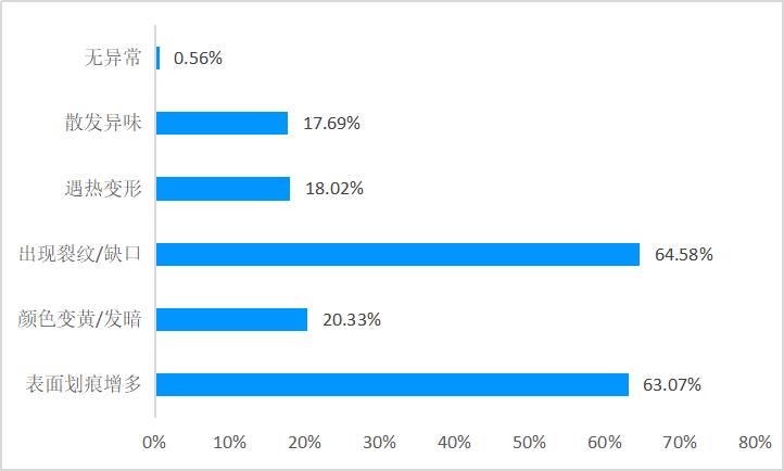 在使用密胺餐具过程中,64.58%的人遇到餐具使用一段时间后出现裂纹、缺口,63.07%发现餐具表面划痕越来越多,这两种现象是“重灾区”。还有两成人反映餐具变黄发暗、遇热变形,甚至散发异味,只有0.56%的人使用过程中餐具完好。