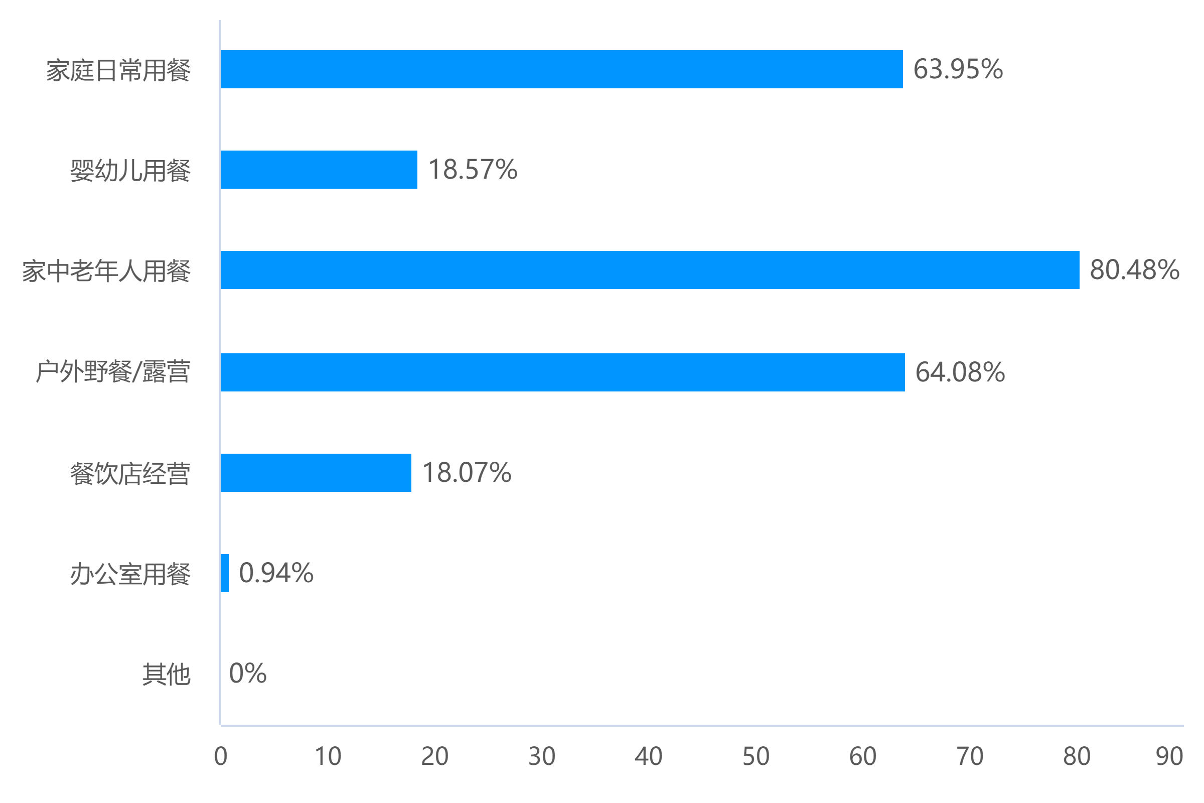 调查显示,18岁—30岁受访者占了94%;超97%的人都买过、用过,96.2%的受访者表示每周会使用3次—5次。使用场景最多的是给家中老人用餐(80.48%)和日常用餐(63.95%),64.08%的人用于户外野餐/露营,18.57%的人用于婴幼儿用餐,还有18.07%的人群用于餐饮店经营。