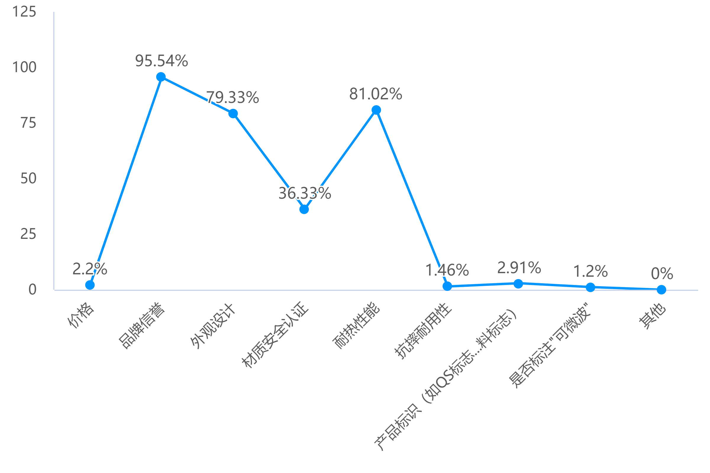 调查显示,大多数消费者选购时优先关注品牌(95.85%)、耐热性(81.02%)、外观颜值(79.33%),只有36.33%的人会关注“材质安全认证”(比如 QS 标志)。