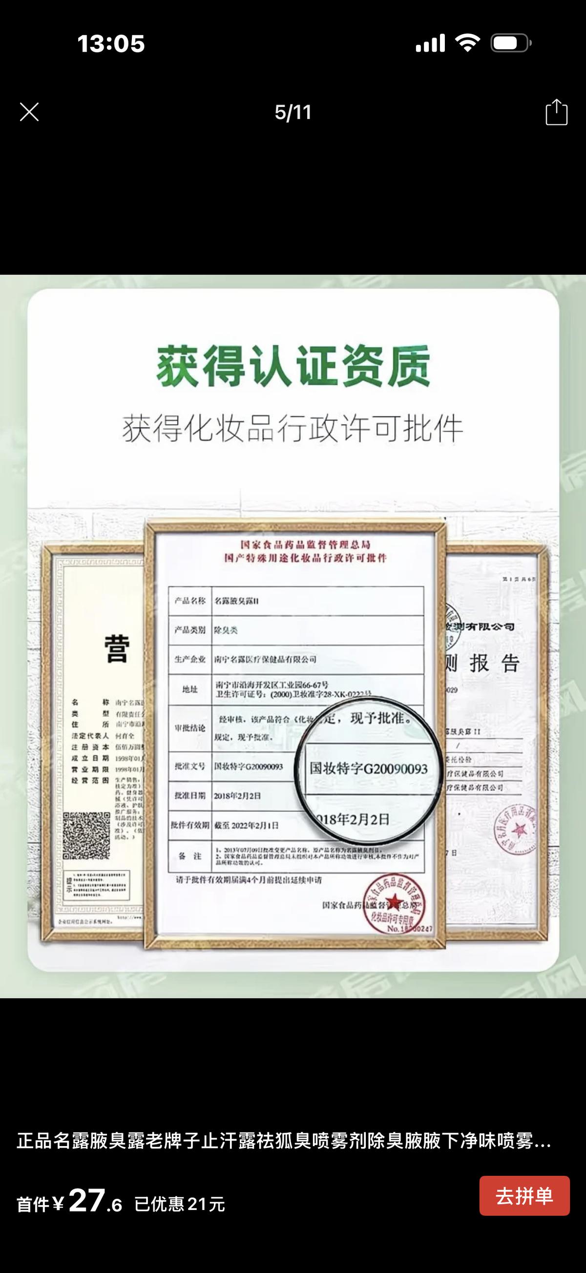 记者查看该产品的参数发现,页面显示其化妆品批准文号为“国妆特字G20090093”,生产日期为2025年1月6日,功能为“去狐臭,除臭”,适用肤质为“多种肤质”。随后,记者通过化妆品监管APP对该批号进行查询,结果显示产品名称为“名露腋臭露Ⅱ”(原名为“名露腋臭剂Ⅱ”),生产企业为南宁名露医疗保健品有限公司。该批准文号的批准日期为2018年2月2日,有效期至2022年2月1日,当前显示为“已过期”,并附有备注说明“国家食品药品监督管理总局未组织对本产品所称功效进行审核,本批件不作为对产品所称功效的认可”。备注中还指出“根据《化妆品监督管理条例》规定,该产品可销售至2025年12月31日,逾期不得生产、进口、销售”。