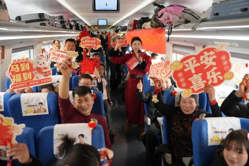 在上海虹桥至寿县返乡专列车厢内洋溢着归途的喜悦与温馨