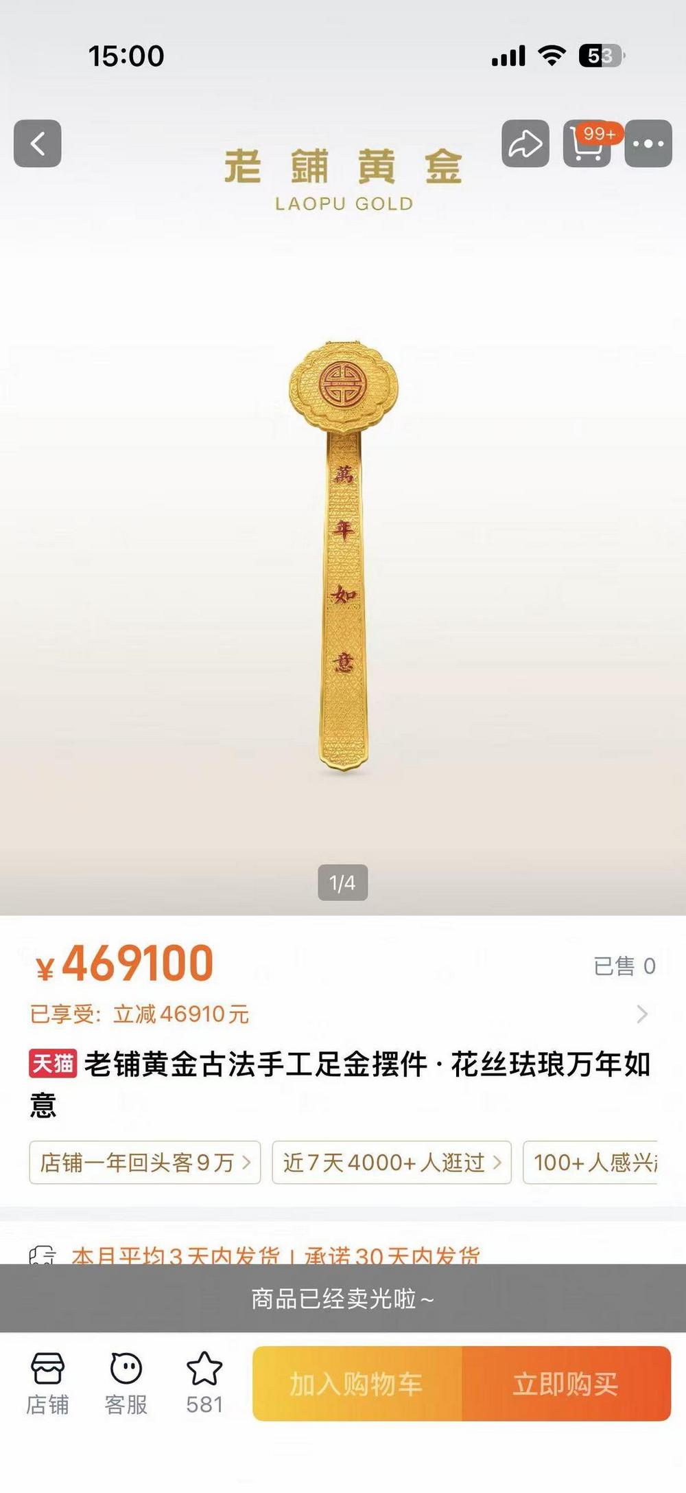 值得一提的是,当天14点开卖后,不足10分钟,售价62.75万元的花丝真言金碗、50万元的鸳鸯和合摆件、30万元的金蟾等足金摆件商品即显示售罄,同时有超30款单品上架即被秒空。热门单品供不应求,其中,古法手工足金项链十字金刚杵钻饰吊坠两款货品单日成交均近亿元;八宝随身金佛、葫芦钻饰及七子葫芦吊坠等5款单品单日成交破5000万元;另有近30款单品单日成交破1000万元。