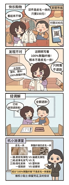 前不久,消费者徐女士向本报维权热线85188518反映,她于去年12月27日,在西湖区丽景路78号杭州丽景路农贸市场二楼051号商铺,支付230元购买了一件短款白色外套。“商家称衣服是‘皮毛一体’,我买回家后才发现衣服没有吊牌,水洗标写明里料和面料是‘100%聚酯纤维’。”徐女士想要退款,商家却称只能帮忙转售衣服。(详见3月10日第7版本报刊登的《“皮毛一体”=“100%聚酯纤维”?购买的外套是什么材质 双方说法不一》)