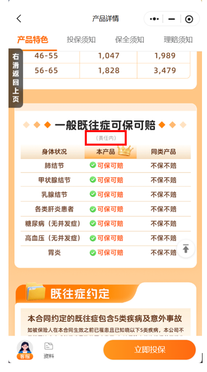 二是视觉设计弱化关键信息。部分产品用醒目字体宣传保障亮点,却以灰色小字、页面角落标注等方式弱化赔付前提、责任限制等核心内容。明亚保险经纪平台销售的一款免健告医疗险,醒目宣传“一般既往症可保可赔”,却在下方用低对比度小字标注“责任内”这一关键限制,让消费者误以为既往症可无条件赔付。