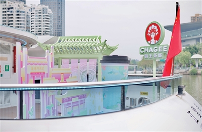 不同于传统的运河游船,“江雪号”联名船船身巧妙地将霸王茶姬的品牌视觉符号与杭州运河的文化元素融为一体;客舱内错落点缀着拱宸桥、武林门码头牌坊等运河地标符号,运河的粼粼波光与充满中式意蕴的设计交相辉映,一步一景。